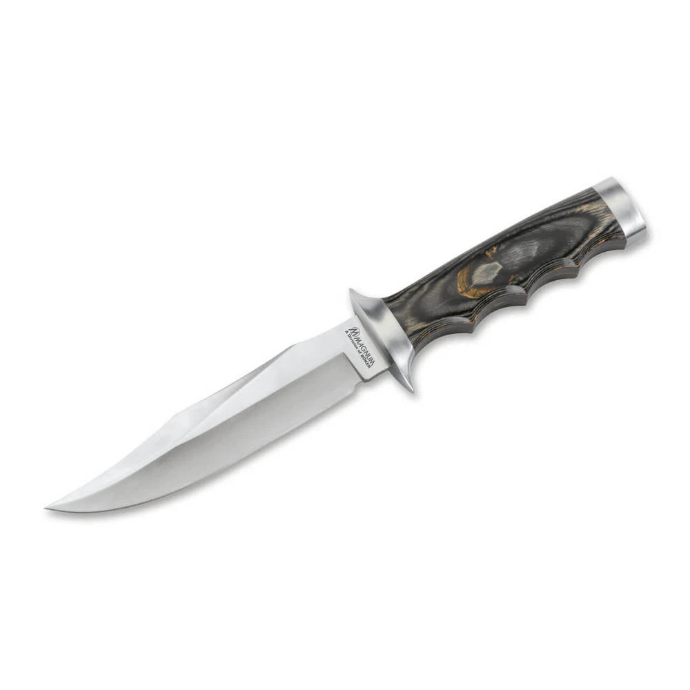 L’impressionnant Magnum Jungle Devil est un couteau de chasse avec lame bowie et manche en bois de Pakka. La lame n’est pas en acier damas.