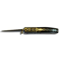 Le manche possède une mitre aux mêmes motifs damas que la lame, et il est prolongé par une plaquette de bois coloré en noir de chaque coté. La lame est verrouillée par un mécanisme liner-lock pour garantir une sécurité maximale.