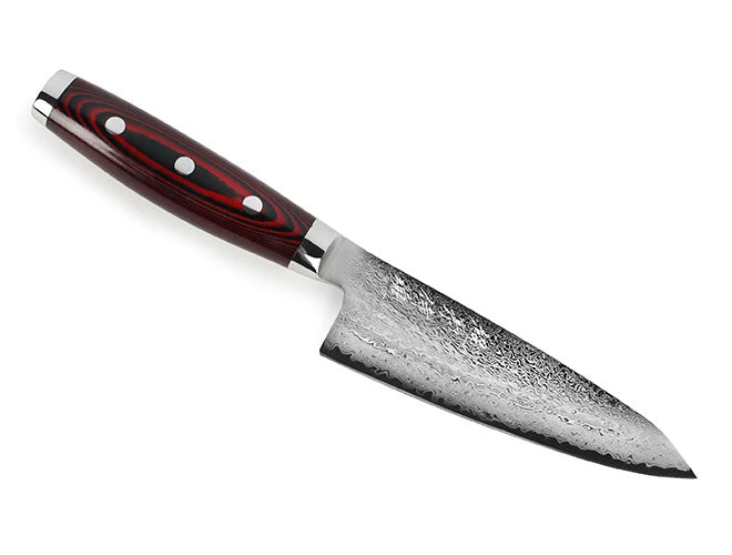Le couteau de chef Super Gou de Yaxell est conçu pour trancher, couper en dés et hacher une gamme complète de fruits, de légumes et autres. Avec son ventre incurvé, le couteau de chef peut être doucement balancé dans les herbes fraîches ou les épices pour produire un hachis très fin.