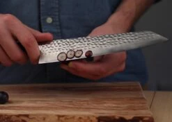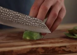 Au-delaÌ de lâattrait estheÌtique, le martelage de la lame âTsuchimeâ creÌeÌ de petites poches dâair entre la lame et les tranches de nourriture. Cette meÌthode ancestrale japonaise empeÌche la nourriture de coller aÌ la lame pour une deÌcoupe agreÌable et rapide.